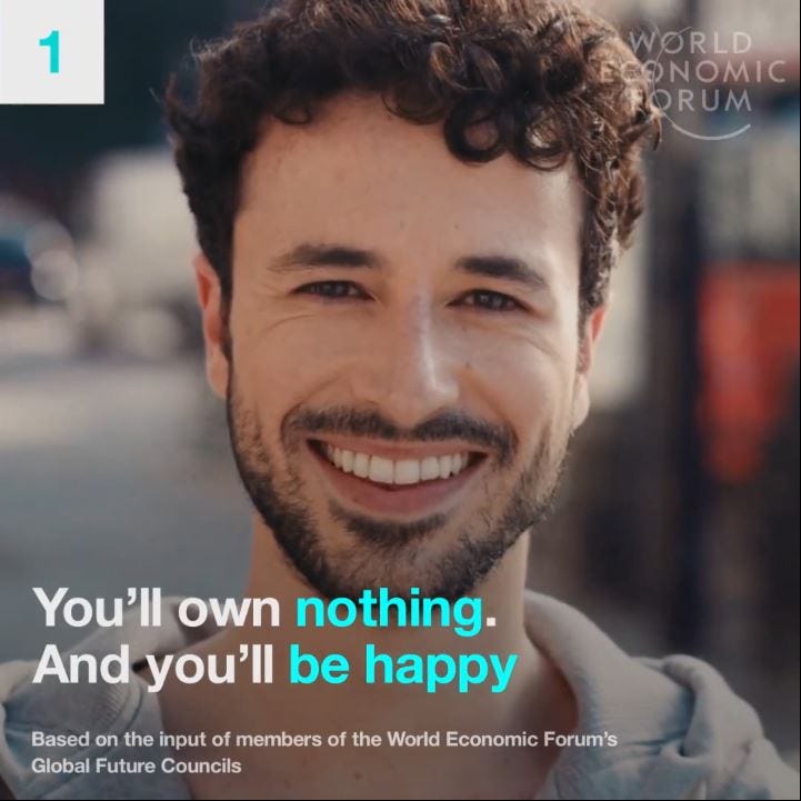 By now, you've probably heard the interesting phrase "You'll own nothing and you'll be happy," thrown around. You've likely seen the above picture. This is from a video produced by the World Economic Forum, the latest organization of major politicians and financial elite to be targeted by conspiracy theorists and cowards.