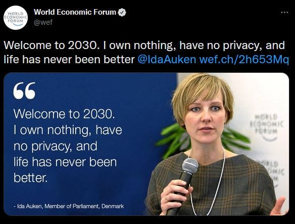And don't think it is an idle threat. You will find that a surprisingly large portion of the leading politicians in major countries are members of the World Economic Forum. Far from the most prominent among them is Danish MP Ida Auken, who openly states the following: